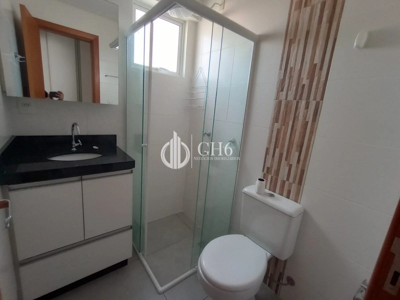 Banheiro social com armário e box em vidro temperado