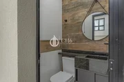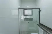 Banheiros com box, revestidos ate o teto. contendo bancada de granito e espelho. bacia sanitária com caixa acoplada. escada revestida com porcelanato, tendo um detalhe de acabamento com filete em inox e corrimão.